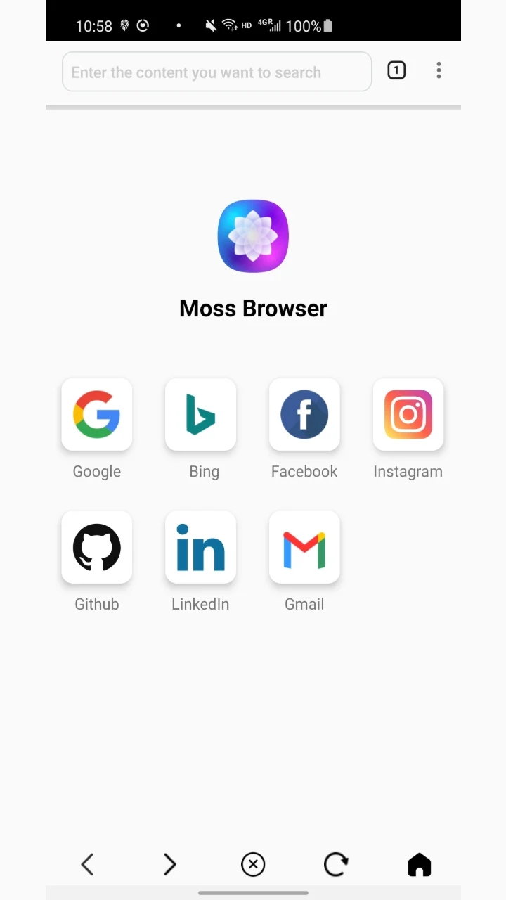 La interfaz de Moss Browser es limpia, moderna e intuitiva, diseñada para minimizar distracciones y facilitar el uso. Desde la primera pantalla, te recibe con una barra de búsqueda y navegación simple. Las pestañas están organizadas de forma fluida, y todas las herramientas necesarias están a un solo toque.